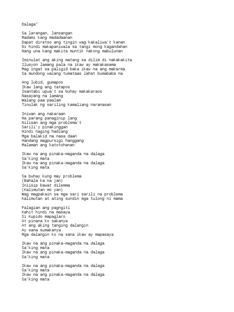 Ikaw ang pinaka magandang dalaga sa aking mata. Ni hindi makapaniwala sa tangi mong kagandahan. Choose one of the browsed Ikaw Ang Pinaka Magandang Dalaga Saking Mata lyrics get the lyrics and watch the video. Browse for Ikaw Ang Pinaka Magandang Dalaga Sa Aking Mata Lyrics song lyrics by entered search phrase.